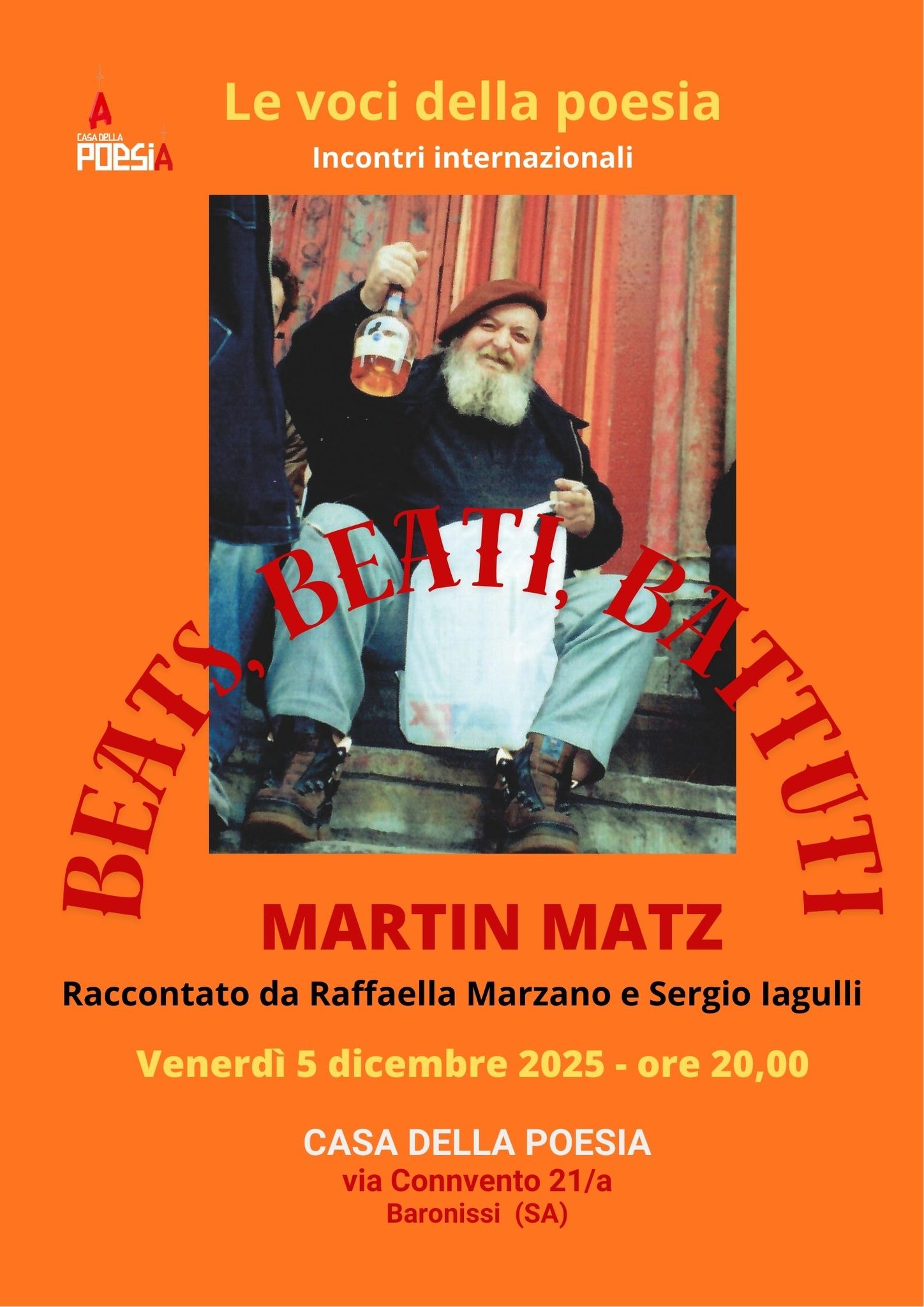 Venerdì 5 dicembre 2025, alle ore 20,00 a Casa della poesia (via Convento,73, Baronissi) racconteremo il poeta beat Martin Matz, presente nei primi grandi progetti di Casa della poesia. Nella collana “Tracce” Multimedia Edizioni ha pubblicato due straordinari libri di un protagonista, per anni dimenticato, della beat generation: Martin Matz. Opere visionarie con eleganti sequenze di immagini che si ispiravano ad un surrealismo realizzato attraverso l’uso di sostanze allucinogene. Le traduzioni sono di Raffaella Marzano. La collana “Tracce” documenta il passaggio di grandi nomi della poesia internazionale nei progetti di Casa della poesia e finanzia la sua r/esistenza attraverso la vendita di questi volumi (a colori e con artworks).