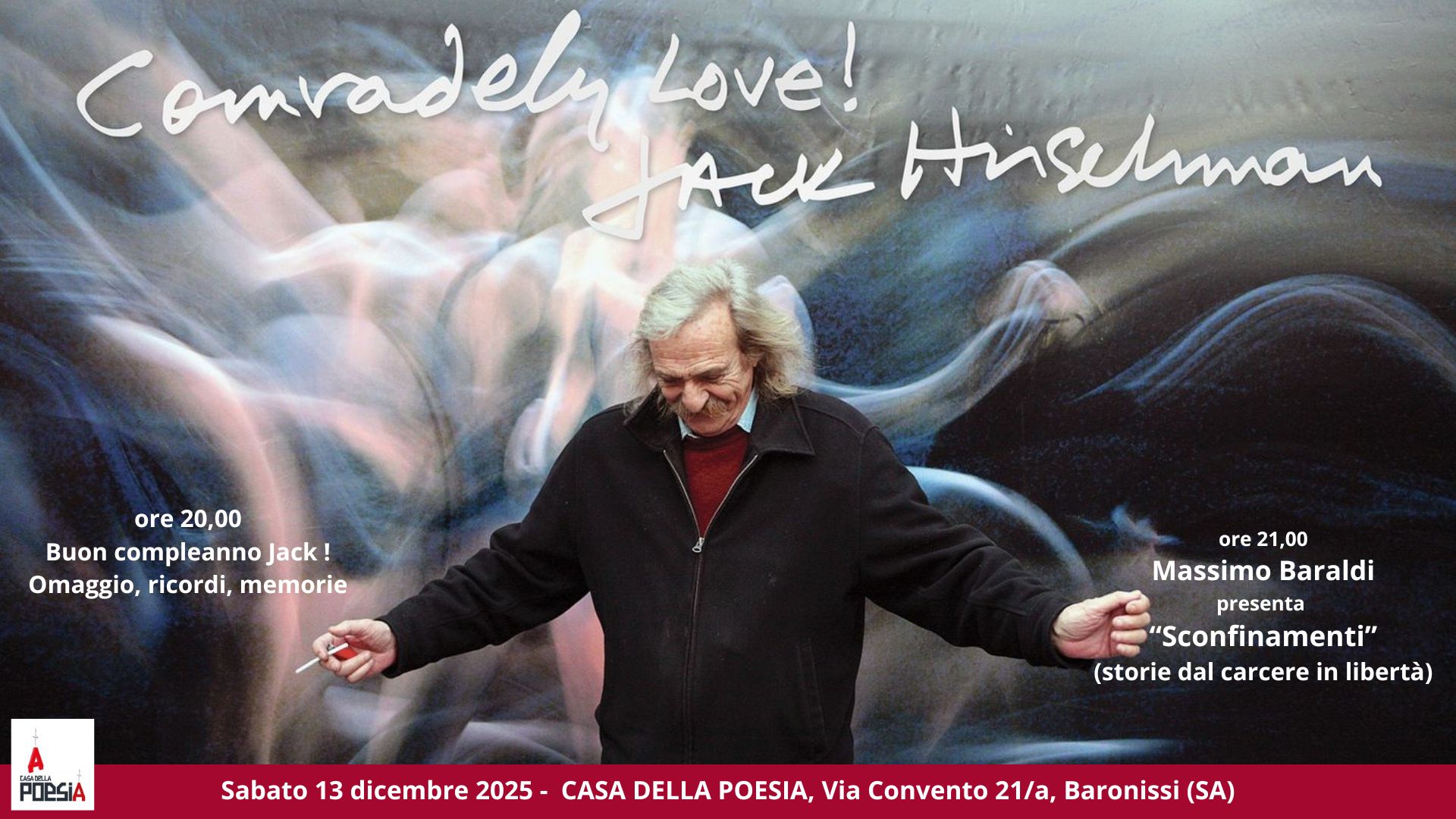 Questa sera, sabato 13 dicembre, ore 20,00, doppio appuntamento a Casa della poesia (via Convento 21/a, Baronissi): ricordo, omaggio, festa per il compleanno di Jack Hirschman, amico, fratello compagno, poeta fondatore (avrebbe compiuto 92 anni) e presentazione del libro “Sconfinamenti (storie dal carcere in libertà)” di Massimo Baraldi che ha raccolto testimonianze, racconti, confidenze, paure e speranze di 22 detenuti dell’Icatt di Eboli.I due momenti della serata non sono così distanti tra loro come potrebbe sembrare. Sarà anche l’occasione per gli auguri di buon Natale e per prepararci al nuovo anno con una fetta di panettone e un bicchiere di spumante. Non mancate. Vi aspettiamo!