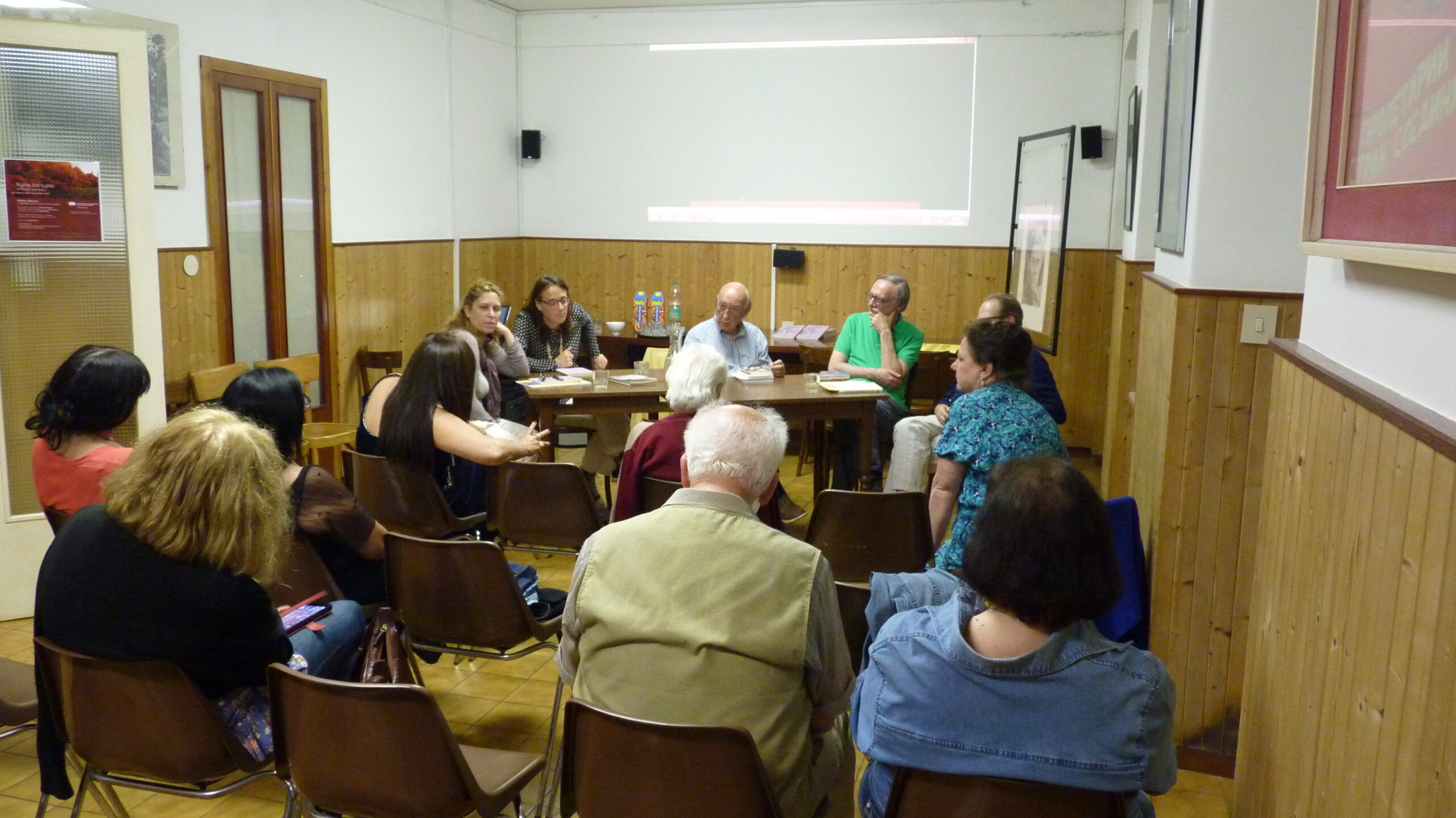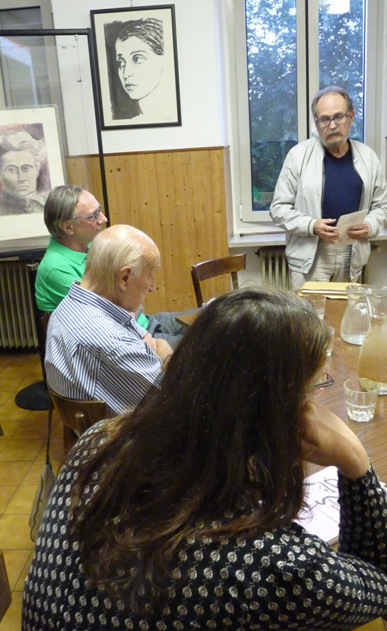 Ma, per gli intricati casi della vita, tale occasione mi è capitata molti anni dopo a Trieste in un reading – dal pregnante titolo ASILO POETICO / PESNISKI ASIL – cui presero parte lui, Barbara Korun e il sottoscritto, il 25 maggio 2018, presso il Circolo culturale Tina Modotti, nel corso del quale diede vita ad un simpatico “battibecco” letterario con la figlia Cecilia che sedeva tra il non folto pubblico. Al termine della serata ci intrattenemmo insieme all’amico Gianluca Paciucci, organizzatore dell’evento, in una frugale cena a tre presso l’osteria sociale della Casa del popolo, al piano terra del medesimo stabile (mi sembra di ricordare che mangiammo alici fritte e bevemmo del vinello bianco – notazione che non appaia superflua, perché spesso la poesia può celarsi nelle cose più semplici, come queste). Mi colpì la cordialità e il garbo di questo scrittore già molto noto (e con un impressionante curriculum, destinato l’anno successivo ad arricchirsi ulteriormente con il prestigioso Premio Nonino https://premio.grappanonino.it/winner/juan-octavio-prenz/ ) che rimase a conversare amabilmente con noi senza remore di sorta, per il puro piacere della compagnia.