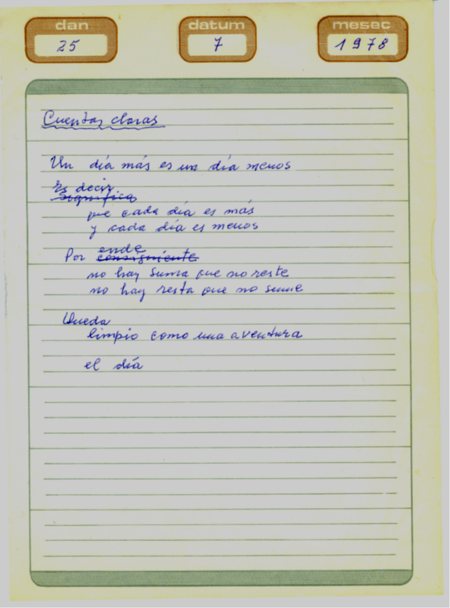 Da queste brevi citazioni possiamo comprendere quanta importanza rivestisse per Prenz l’elaborazione del testo. Abbiamo la fortuna di poter vedere la prima stesura manoscritta di Cuentas Claras, – un testo di importanza capitale nell’opera di questo poeta, come da lui stesso affermato (vedi infra) – con alcune correzioni che ci mostrano il suo impegno nella ricerca del mot juste (della parola esatta, precisa):